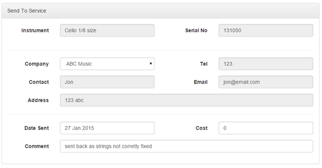 instrument from service, click on the Return From Service button at the bottom of the instrument information block. This will pop-up a screen that you can enter the return date, the cost of the service and any comments related to the service. Click the 'Return from Service' button and the instrument will no longer show any company information and there will be a new service history record showing below the information block with the latest service.