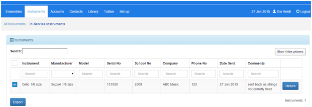 To view all instruments that are currently in-service, go to the Instruments menu option and select the 'In-Service Instruments' option. This will show you a list of all instruments currently marked as being serviced.